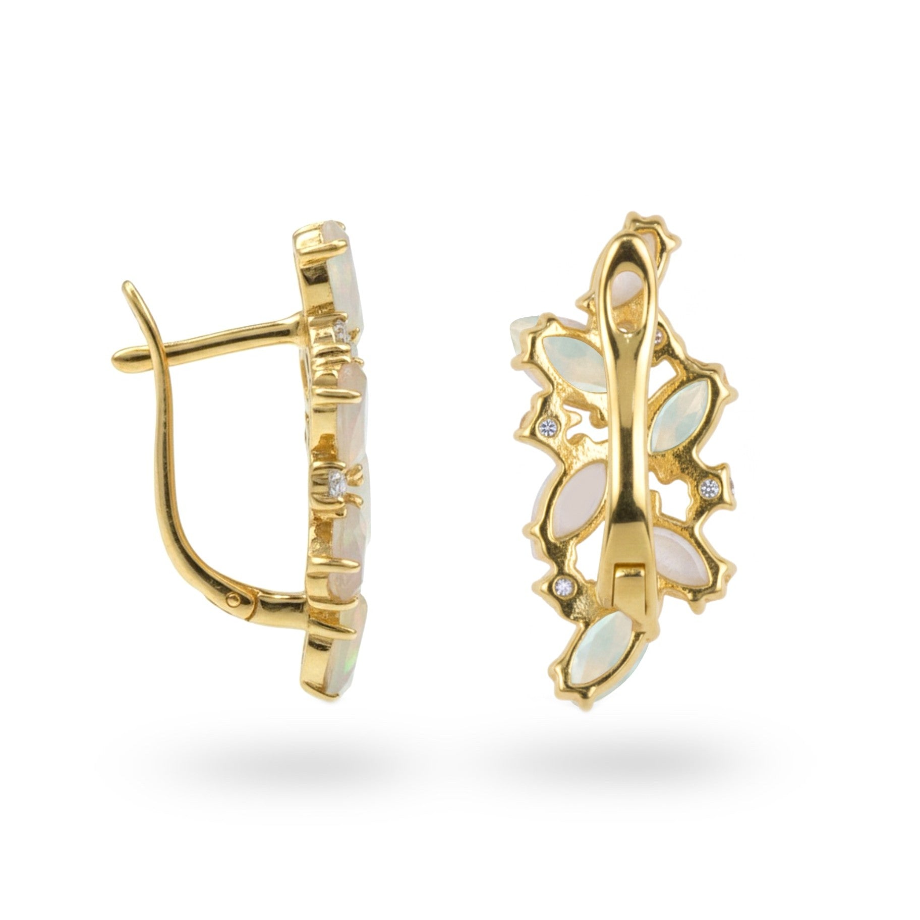 These aqua chalcedony earrings are crafted in 925 sterling silver with a polished yellow gold finish suited for everyday wear. The earrings carry a gross weight of 3.353 g and a net weight of 2.698 g. The design includes six 6 × 3 mm marquise aqua chalcedony stones with a total weight of 0.888 ct, six 6 × 3 mm white moonstones weighing 0.876 ct, and eight 1.75 mm white topaz stones with a weight of 0.213 ct. These sterling silver gemstone earrings work well as daily jewelry, office pieces, and small-event accessories. The light drops form fits women who prefer silver earrings or yellow gold drop earrings without bold volume. These aqua earrings also support neat styling for weekends, lunches, and simple work outfits. The secure structure keeps the cluster design steady for long hours. You can also explore our collection to find pieces that match your style.