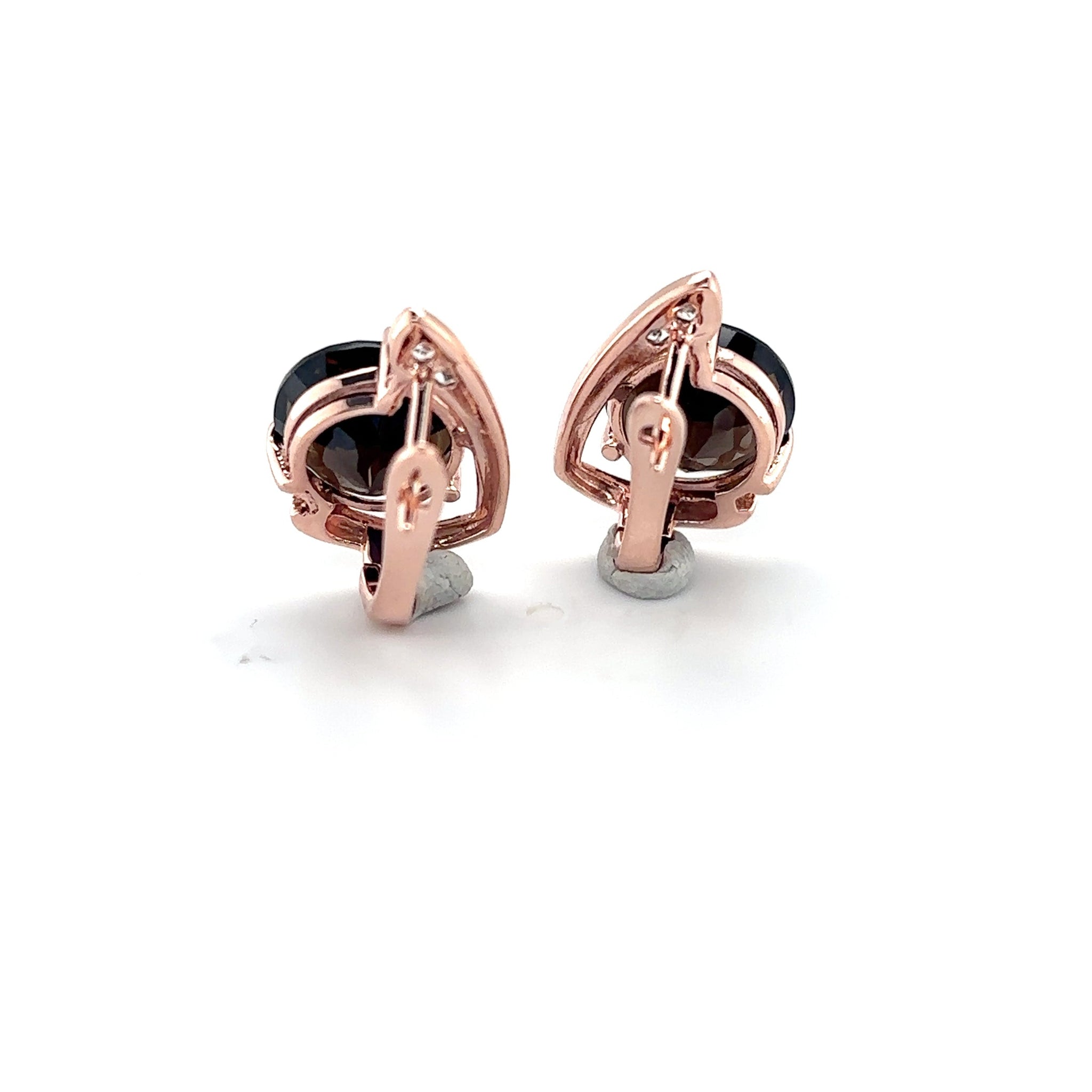 These omega back earrings are crafted in 925 sterling silver with a subtle pink gold finish, combining durability with a refined metallic hue. Each earring features a secure omega back closure, offering a comfortable fit for daily wear. The design highlights two 10 mm round smoky quartz gemstones weighing 6.120 carats, paired with four white topaz stones in 1.75 mm and 2 mm sizes, totaling 0.124 carats. The gross weight is 5.824 grams, and net weight is 4.315 grams. The balanced combination of smoky quartz and white topaz creates a grounded yet versatile look suitable for casual wear, office attire, and evening gatherings. These sterling silver gemstone earrings with a smooth polish offer a minimal, modern appearance that complements U.S. fashion preferences for brown gemstone earrings and silver gemstone earrings.