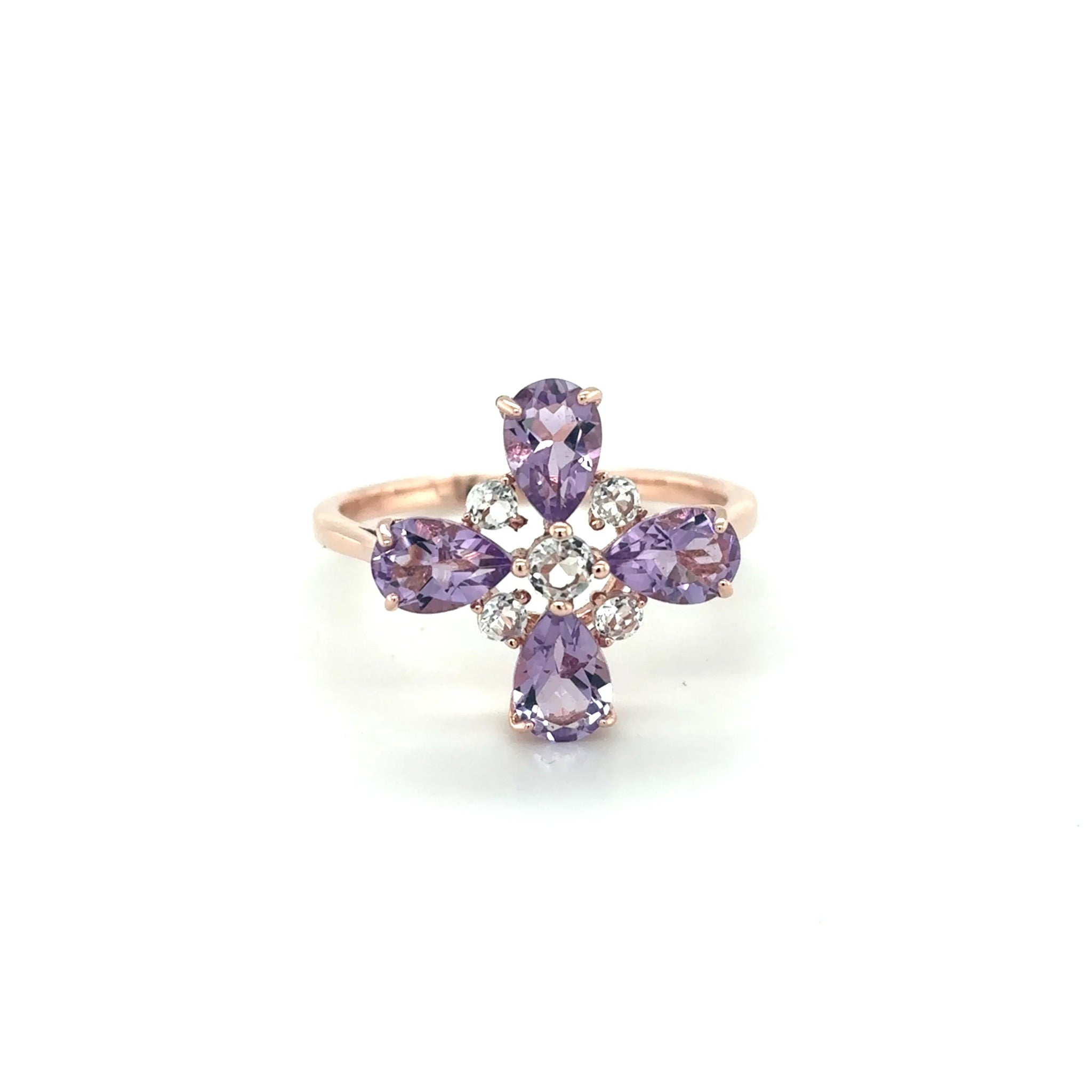 This four leaf clover ring is expertly crafted from solid 925 sterling silver. With a luxurious 0.5 micron pink/rose gold plating for lasting shine and durability. The ring has a total metal weight of 2.30 grams and features a vibrant genuine amethyst measuring 6 x 4 mm. And weighing 1.12 carats. Surrounding the amethyst are five sparkling white topaz accent stones – four at 2 mm (0.16 ct total). And one at 2.75 mm (0.11 ct) – adding brilliance to the clover-shaped design.