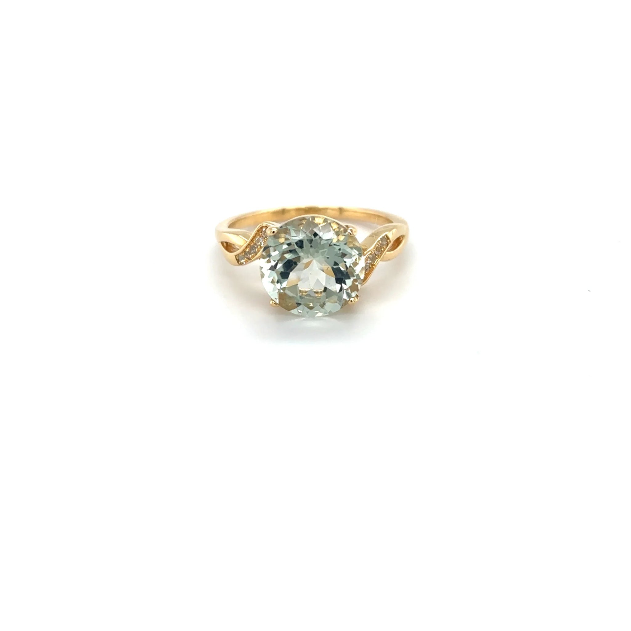This exquisite round green amethyst ring is crafted in solid 925 sterling silver with a 0.5 micron yellow gold plating finish. The total metal weight is 2.70 grams, giving the ring a refined yet substantial presence. The centerpiece is a natural green amethyst gemstone. Expertly cut into a round shape measuring 10 mm and weighing 3.06 carats, showcasing its vibrant light green hue. Surrounding the main stone are 10 natural white topaz accent stones. Each measuring 1 mm and totaling 0.05 carats, adding subtle sparkle and complementing the center stone beautifully.